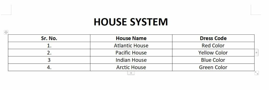 The students are divided into four houses .This has been done to develop a house spirit and team spirit for taking part in various activities .Each House is looked after by a house-Incharge, who in turn is assisted by other staff members and House- Prefect, House-Captains and Vice- Captains selected from the students. The latter develops the qualities of leadership, while leading other students of the house.